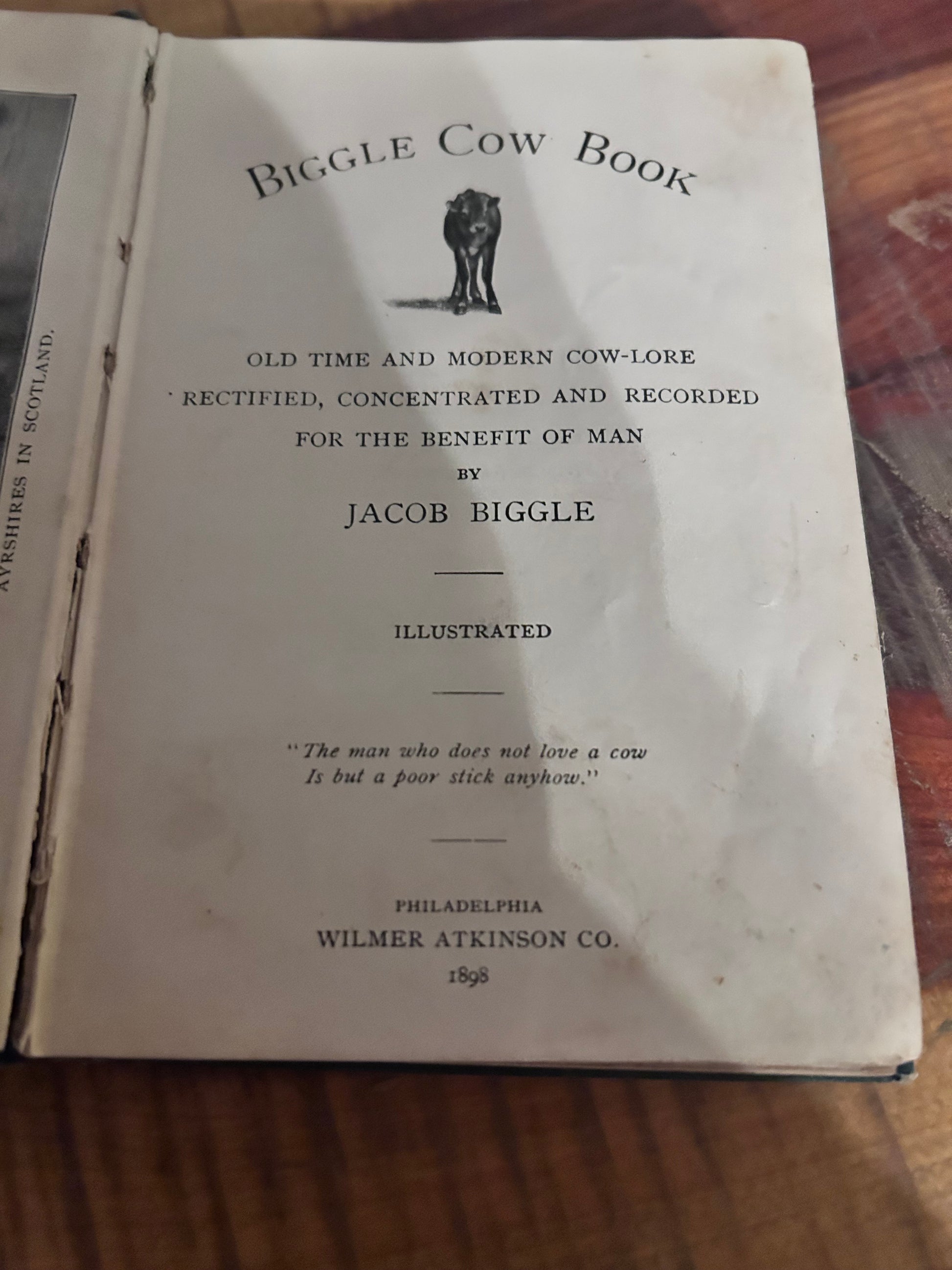 Learn about the care and keeping of cows with "Biggle Cow Book"! Written by farming expert Jacob Biggle in 1898, this book is the fourth installment in the Biggle Farm Library series. With detailed information on cow husbandry and in good condition, this book is a valuable addition to any farm library.
