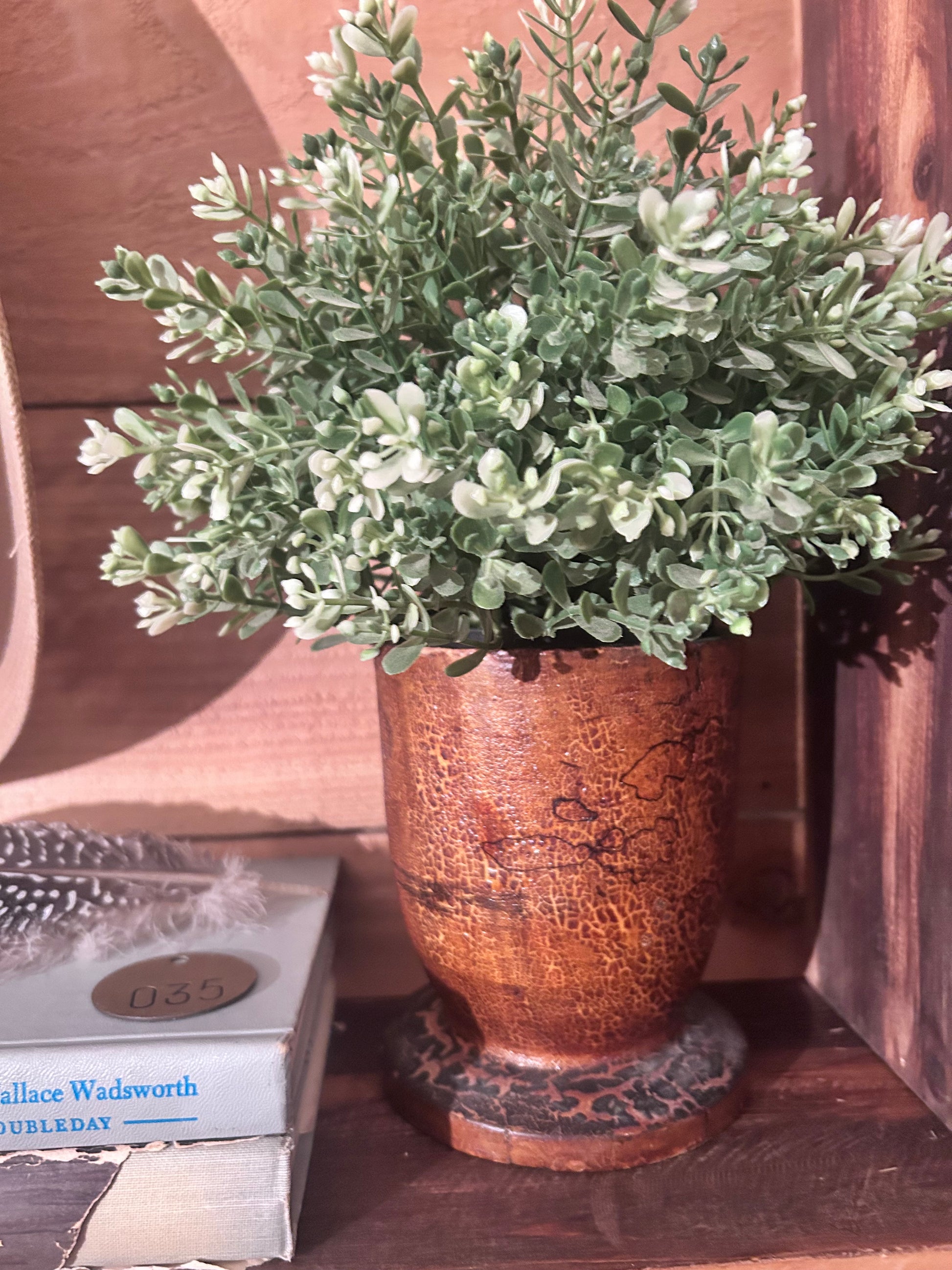 As a vintage piece with hand-carved wooden patina, this mortar makes for a unique and decorative addition to any space. Not only is it great for use as a planter, but it can also serve as a statement piece on a desk with pens. Add a touch of cultural and historical charm to your home or office.