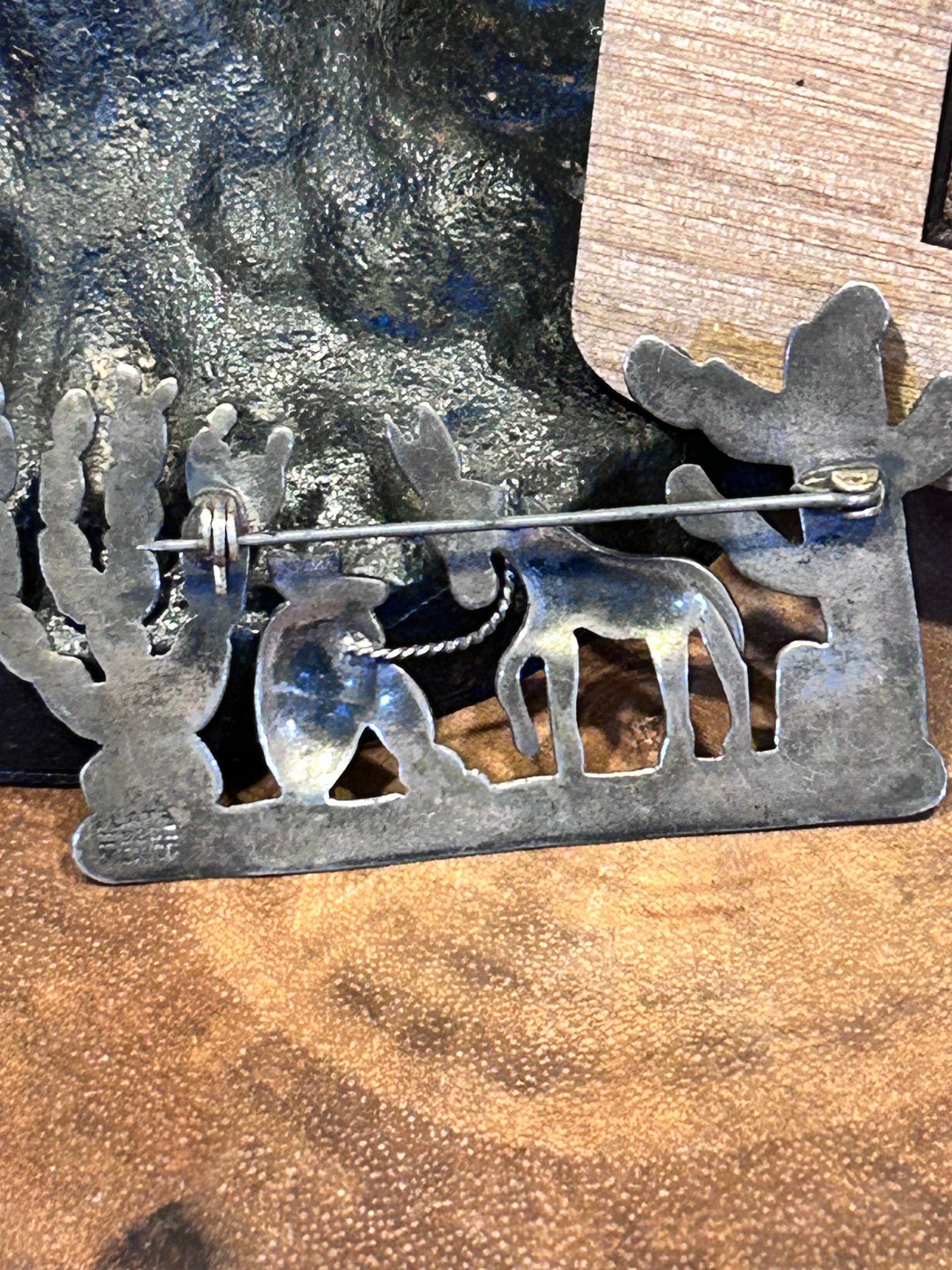 Add a touch of Western charm with the vintage Plato Brooch. Crafted in sterling silver, this brooch-pin features a man, a donkey, and cacti, adorned with turquoise accents. The patina adds a rustic touch, while the 925 Mexico marking guarantees its quality. Perfect for storytelling and accessorizing.