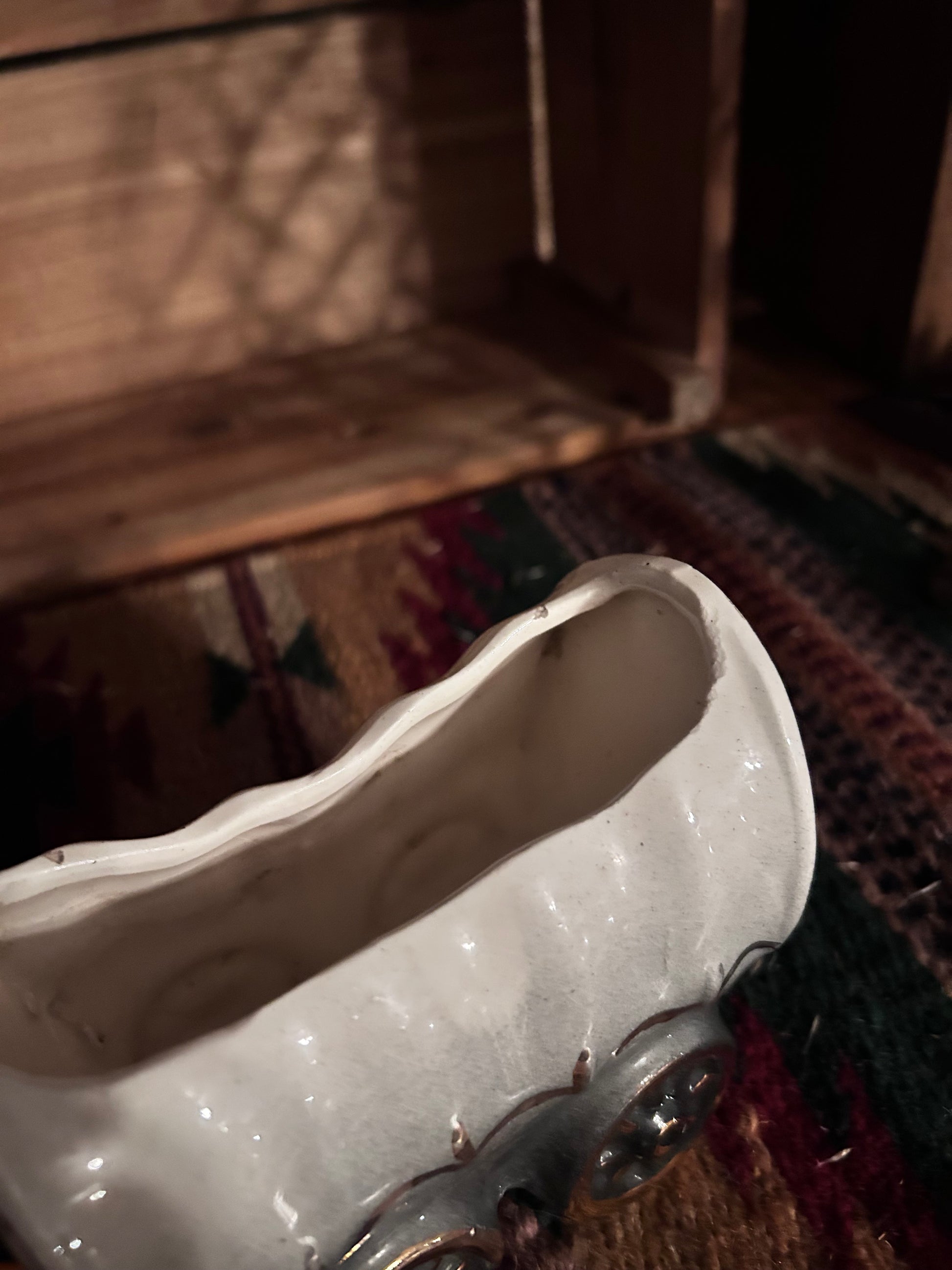 Crafted by Shawnee Pottery, this vintage covered wagon planter adds a touch of history with its gold accents. Bring a piece of the past to your home while admiring the craftsmanship of this piece. A must-have for any collector or design enthusiast.