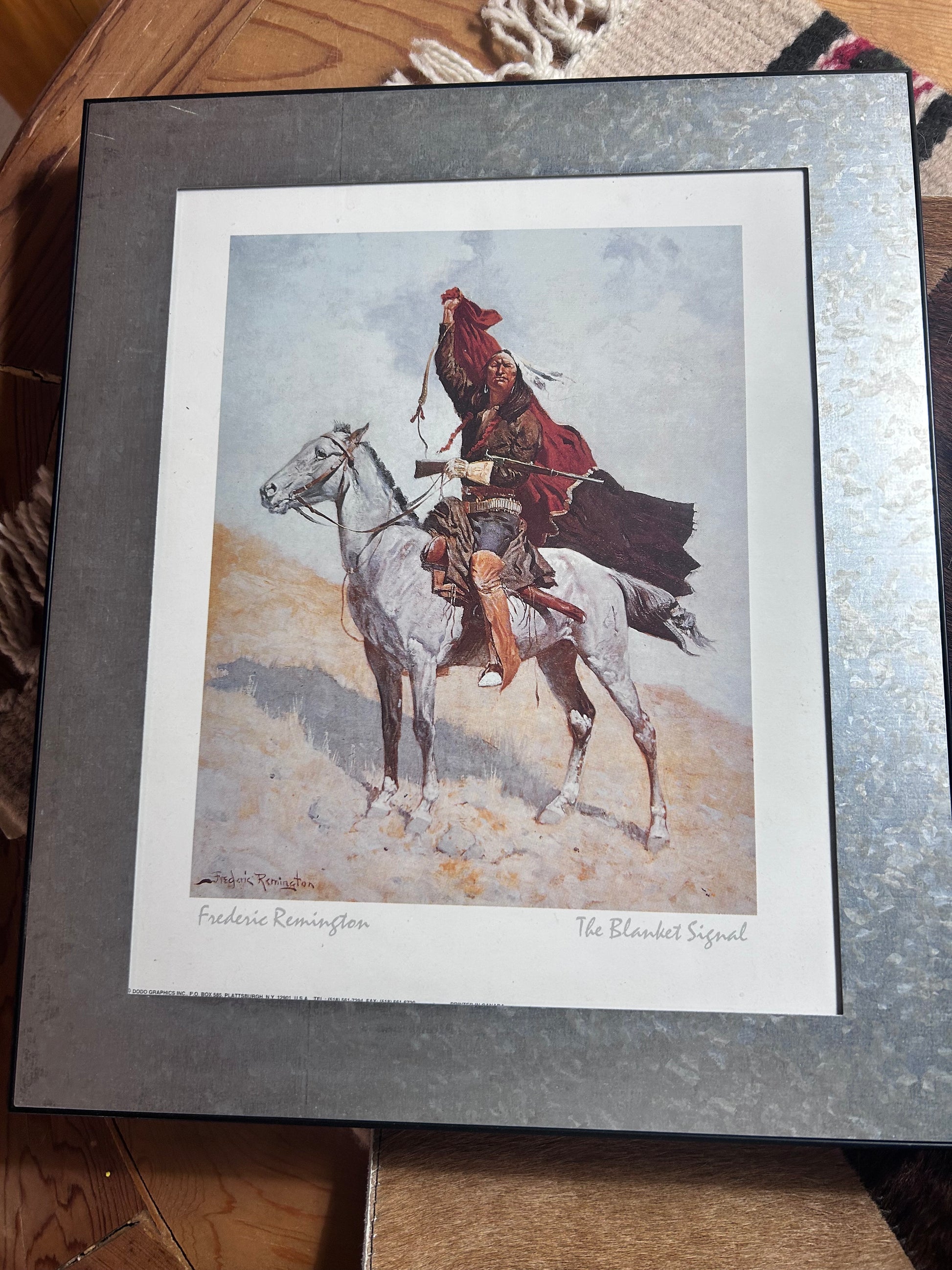 Capture the spirit of the Old West with this 8x10 framed Frederick Remington print featuring "The Blanket Signal." Set in a sleek stainless steel frame, it adds a rugged yet refined touch to your rustic décor. Perfect for those who appreciate classic western art and want to bring a piece of frontier history into their home.