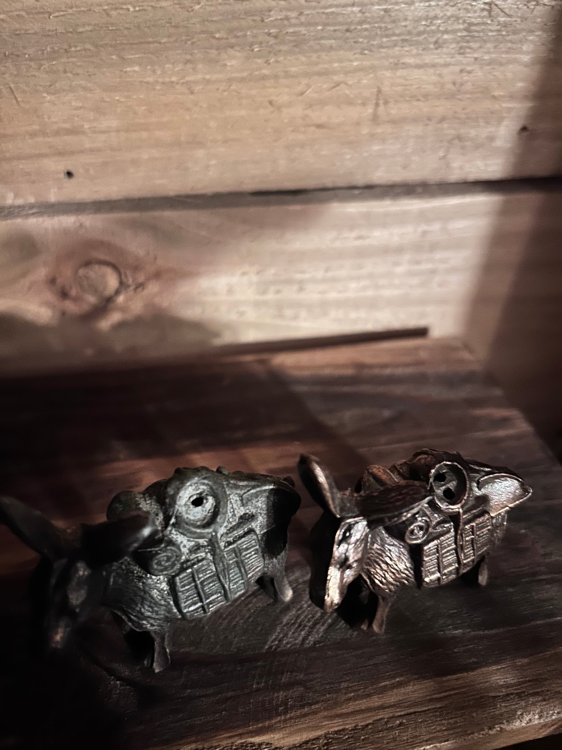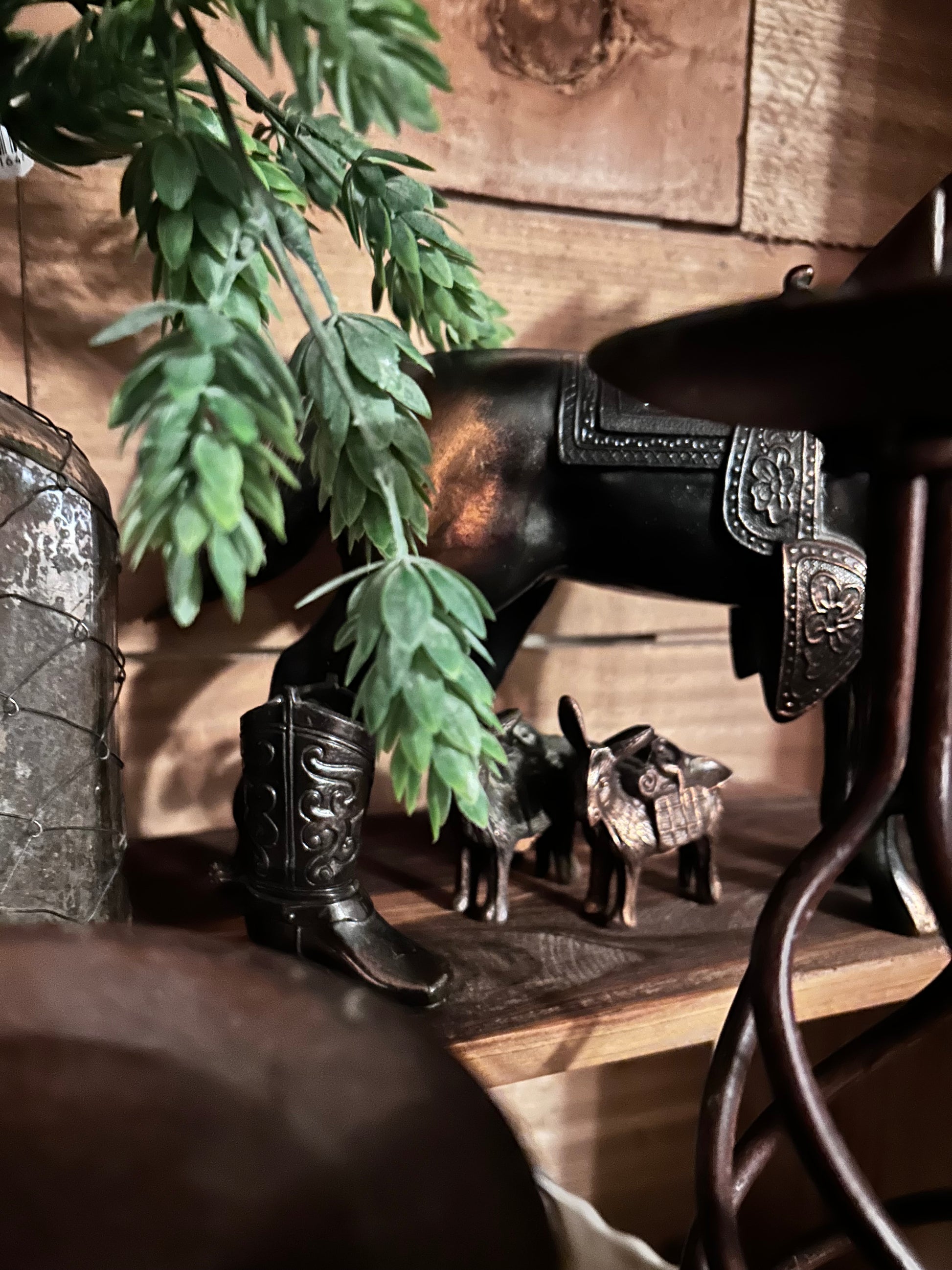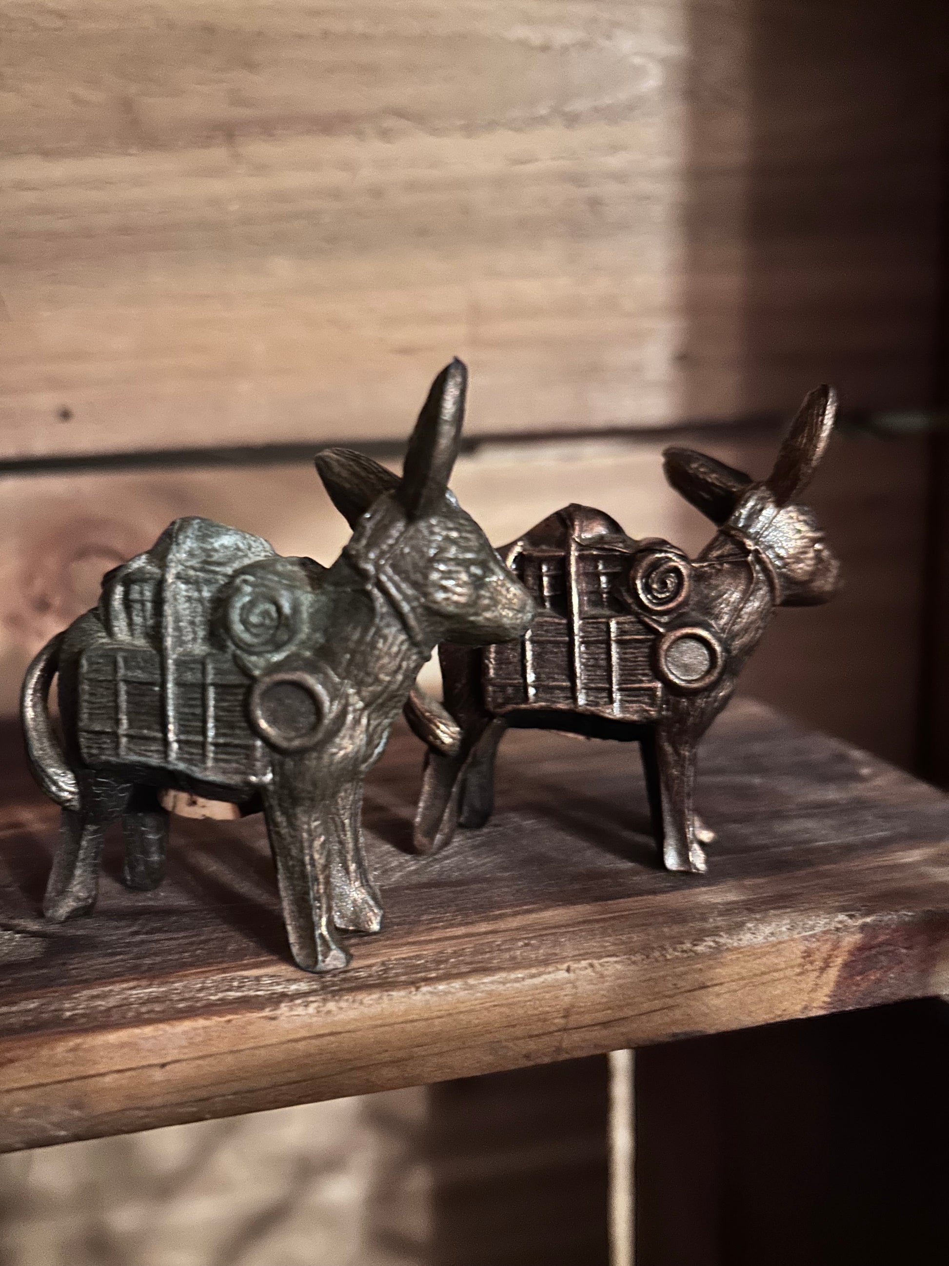 This vintage metal burro salt and pepper set brings rustic western charm to your table. Each shaker shows a unique patina, with one displaying more wear that adds authentic character. Perfect for collectors or those who appreciate a touch of old-world flair in their dining experience.
