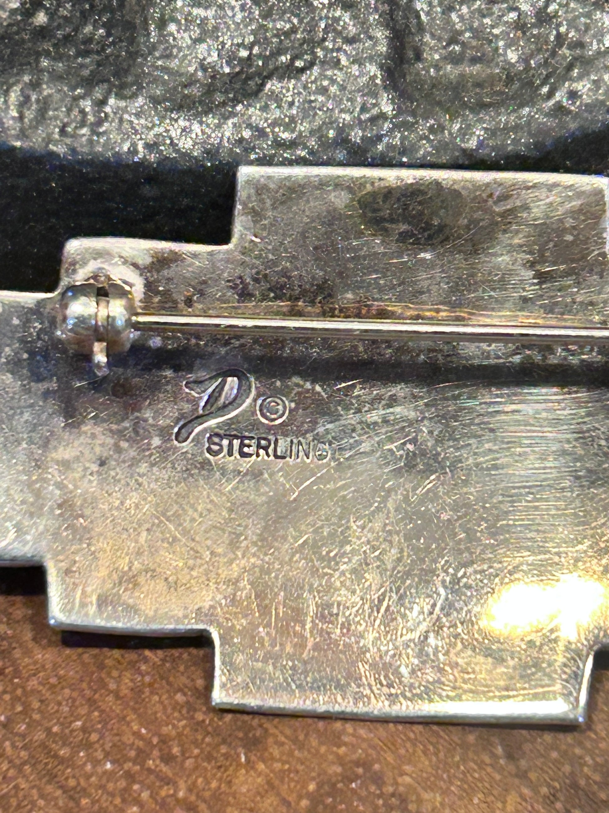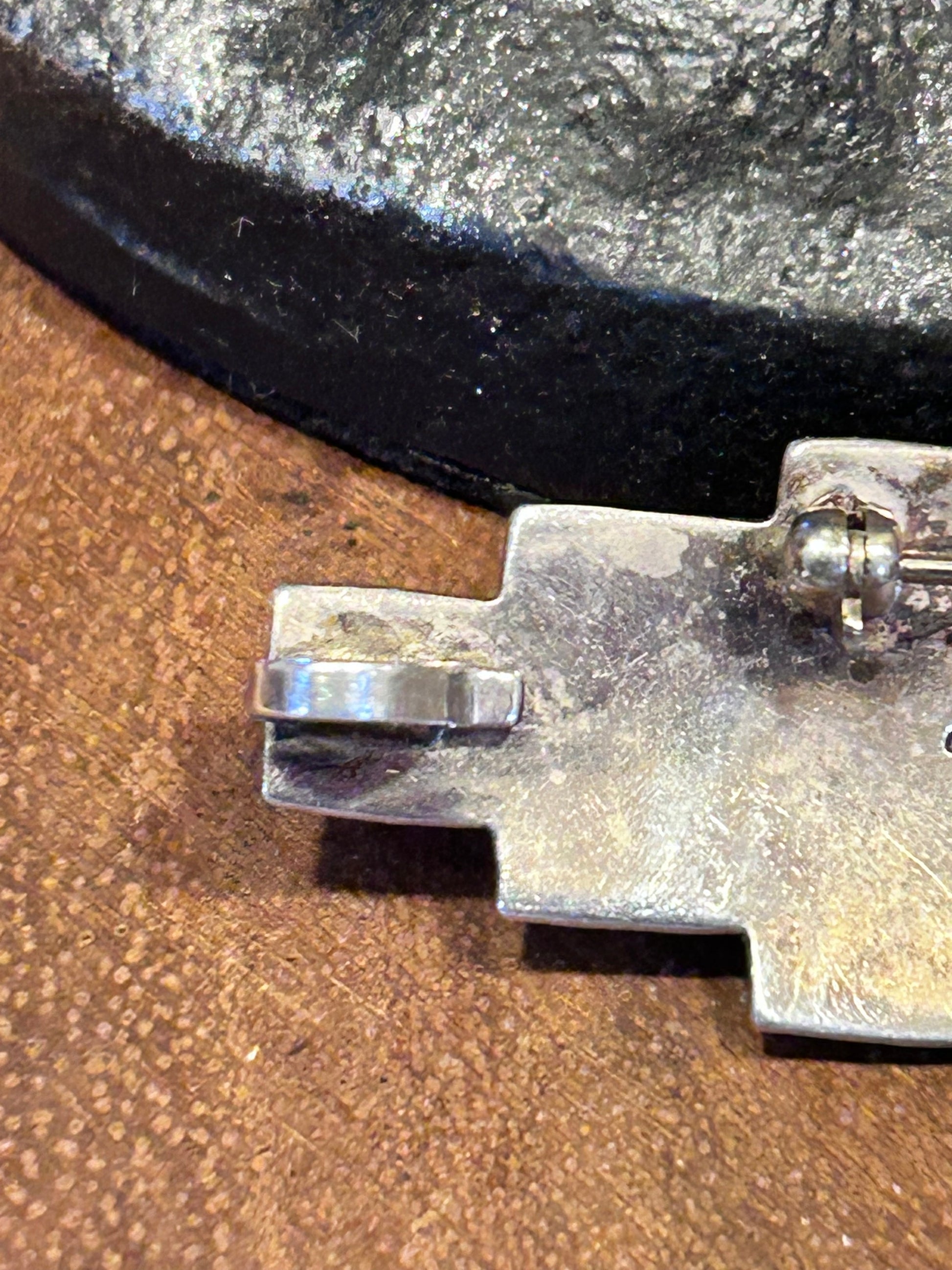 This striking vintage piece captures authentic southwestern artistry in sterling silver, adorned with three rich purple stones that command attention. Measuring 2.5 inches long by 1 inch wide, it's perfectly proportioned for versatile wear—pin it to your favorite jacket or blouse as a brooch, or thread it on a chain to showcase as a pendant. The maker's mark on the back speaks to its genuine craftsmanship and heritage. Whether you're drawn to vintage treasures or southwestern aesthetics, this dual-purpose accessory brings timeless character and natural beauty to any ensemble.