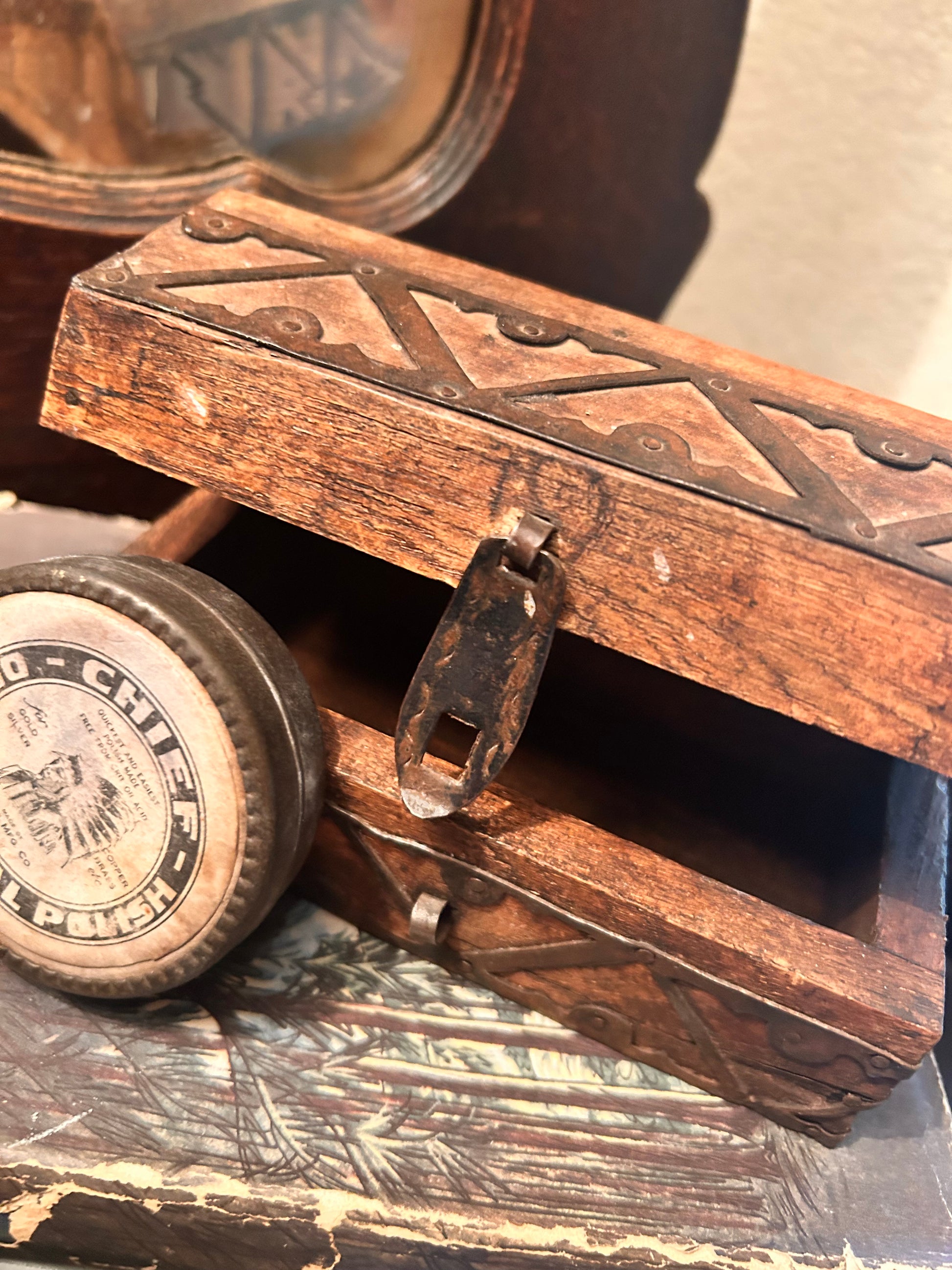 This vintage wooden jewelry box features a sturdy metal closure and a charming patina that highlights its old-world character. Its rustic western style makes it perfect for storing your treasured trinkets while adding a touch of timeless charm to any room. Durable and full of character, this box is both a practical storage solution and a beautiful decorative piece.